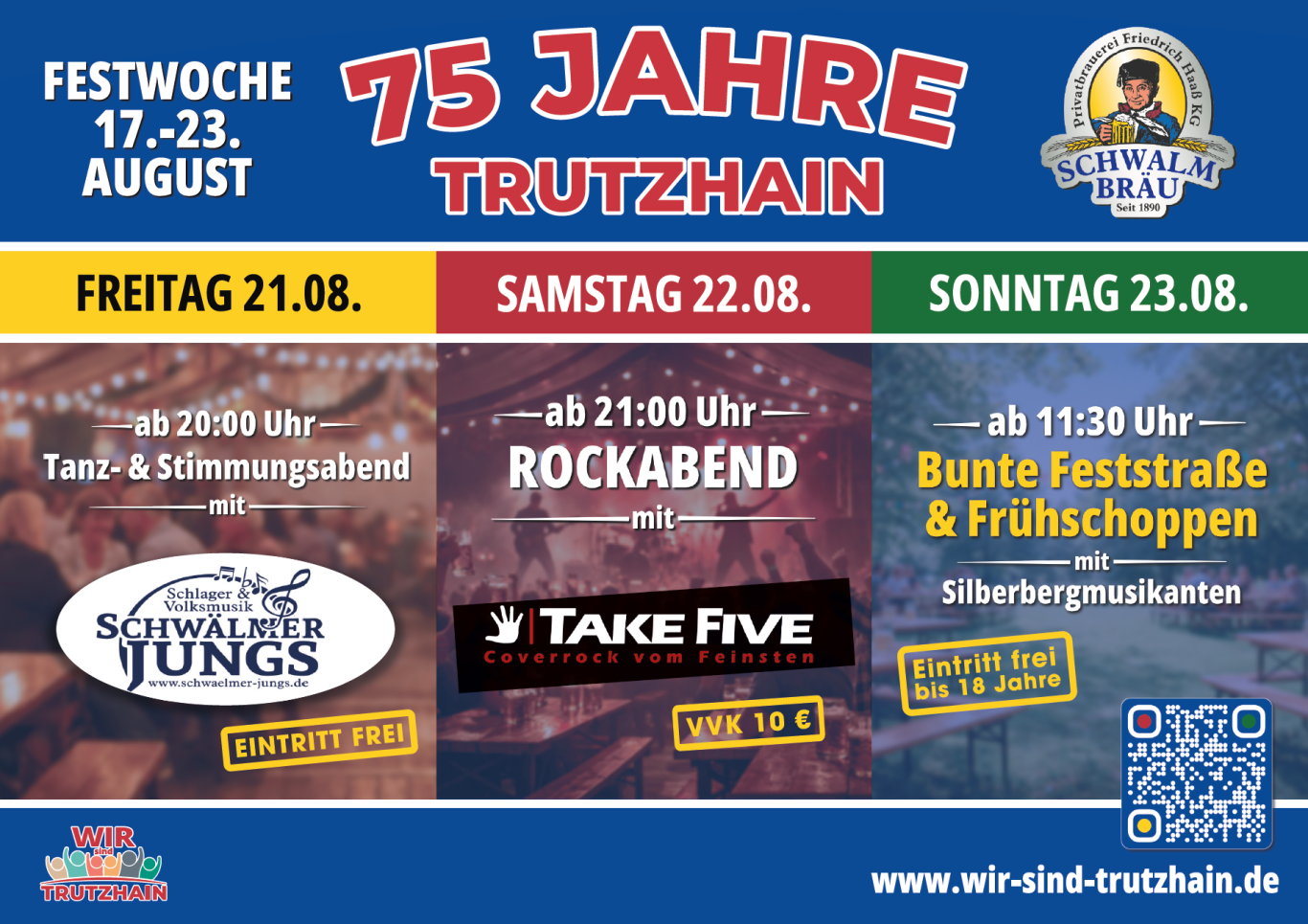 Aktionstag zum 75-jährigen Bestehen des TSV Trutzhain e. V. ab 16.30 Uhr am Sportplatz. Hier werden verschiedene Mitmachangebote in verschiedenen Sportarten vom Kinderturnen über funktionale Gymnastik bis zum Sonnenuntergangs-Yoga angeboten. Zudem wird es Ropeskipping Vorführungen geben mit anschließendem Schnupperkurs für Jung und Alt.